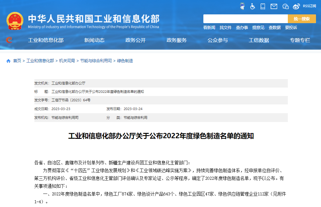 国家级“绿色工厂”创建活动是由工信部组织开展的全国性评选活动,旨在落实《“十四五”工业绿色发展规划》和《工业领域碳达峰实施方案》,持续完善绿色制造体系,助力工业领域实现碳达峰、碳中和目标。入选企业必须满足基础设施、管理体系、能源投入、环境排放等多个指标的高标准和严要求。